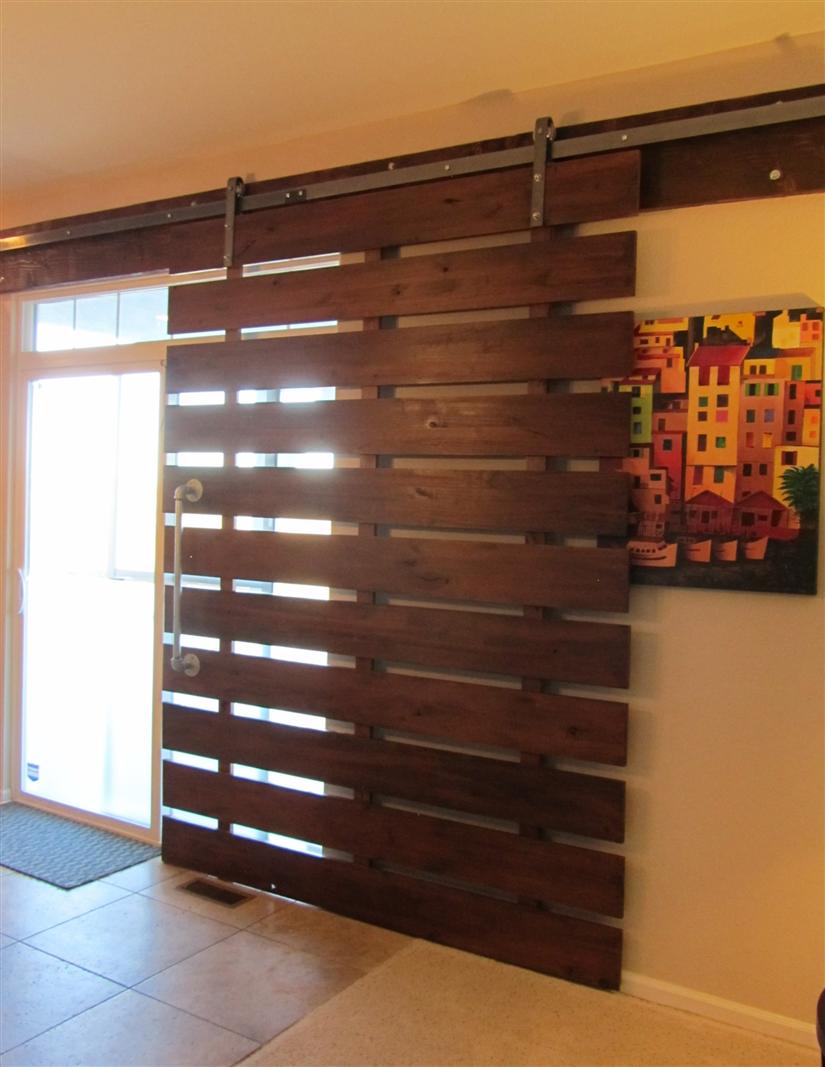 Sliding walnut barn doors manufactured by Sun Mountain Door out of Colorado. They are suspended from a stainless steel overhead track by AMBA Products. Interior by Door Works, Hardware by Better Home Products, Barn doors by Sun Mountain Door, ... Return Doc